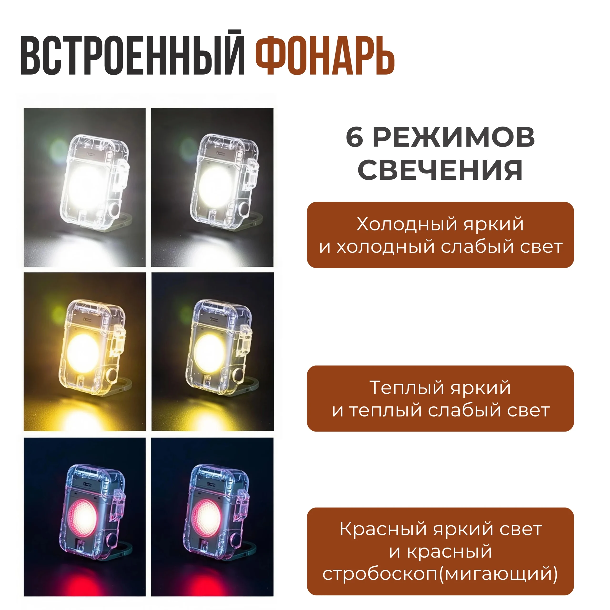 Көп функциялы кіріктірілген қолшам: Жарықтандырудың 6 режимімен жабдықталған: суық жарқын және бәсең жарық, жылы жарқын және бәсең жарық, сондай-ақ төтенше жағдайларға арналған қызыл жарқын жарық және қызыл стробоскоп (жыпылықтайтын).