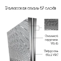 🔹 67 слоев дамасской стали — прочность, износостойкость и эффектный узор на клинке.